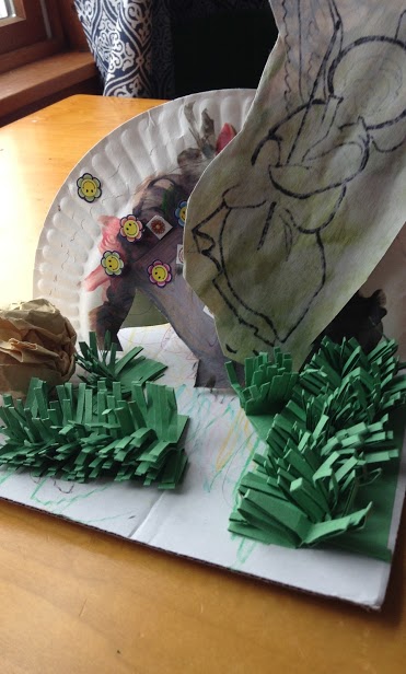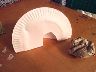 Cut about 1/3rd off plate in a straight line. Cut opening for tomb door. Sometimes I staple the plates- but super glue works well too. *The back plate should not touch the edges of the front, curve it to create the cave* Let the sparks decorate and glue the cave to the cardboard base. Crumple a paperball for the stone. Let the kids roll in open for Pascha!